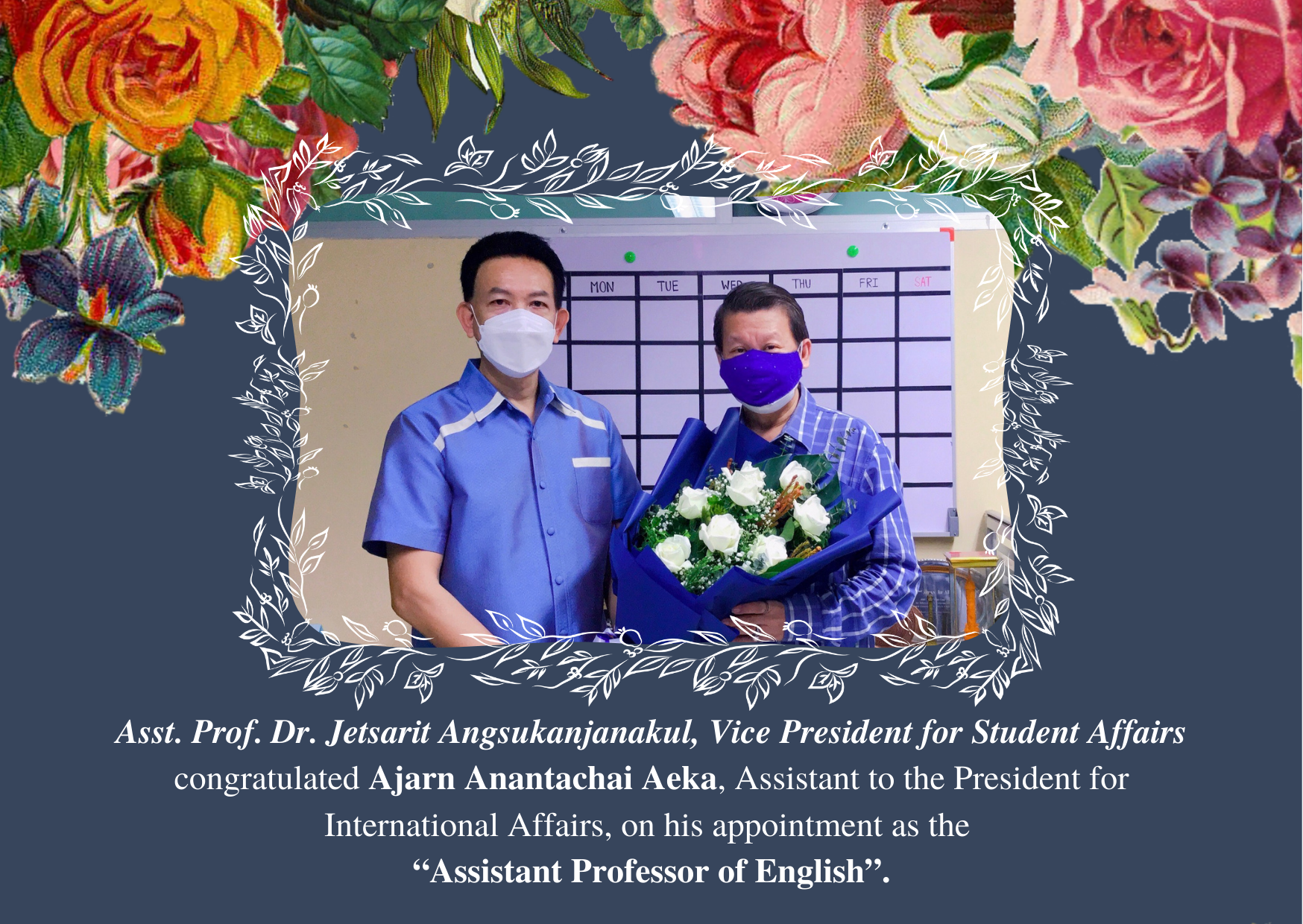 October 15, 2021 – Asst. Prof. Dr. Jetsarit Angsukanjanakul, Vice President for Student Affairs congratulated Ajarn Anantachai Aeka, Assistant to the President for International Affairs, on his appointment as the “Assistant Professor of English”.