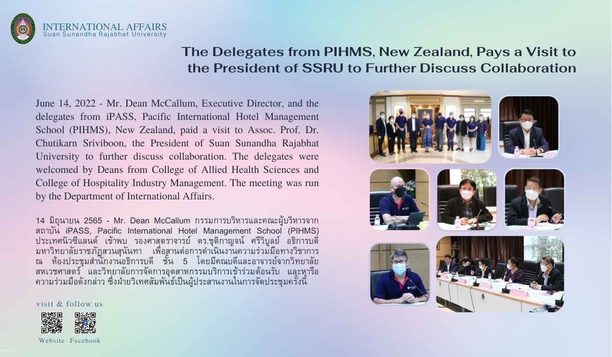 June 14, 2022 - Mr. Dean McCallum, Executive Director, and the delegates from iPASS, Pacific International Hotel Management School (PIHMS), New Zealand, paid a visit to Assoc. Prof. Dr. Chutikarn Sriviboon, the President of Suan Sunandha Rajabhat University to further discuss collaboration. The delegates were welcomed by Deans from College of Allied Health Sciences and College of Hospitality Industry Management. The meeting was run by the Department of International Affairs.