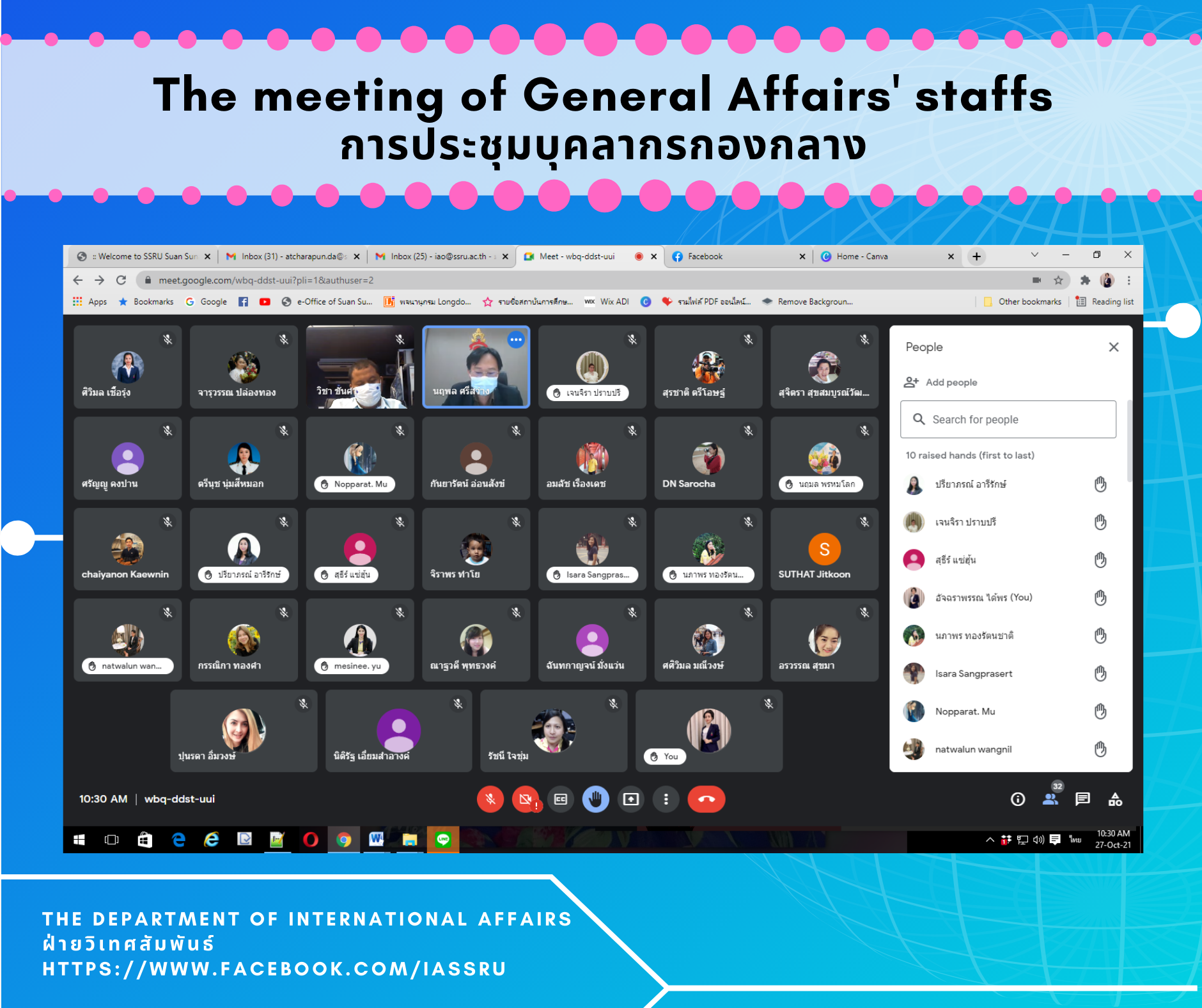 October 27, 2021 – The Department of International Affairs’ staffs attended the meeting of General Affairs’ staffs via Google Meet application, to follow up the 2022 action plan of each department.
