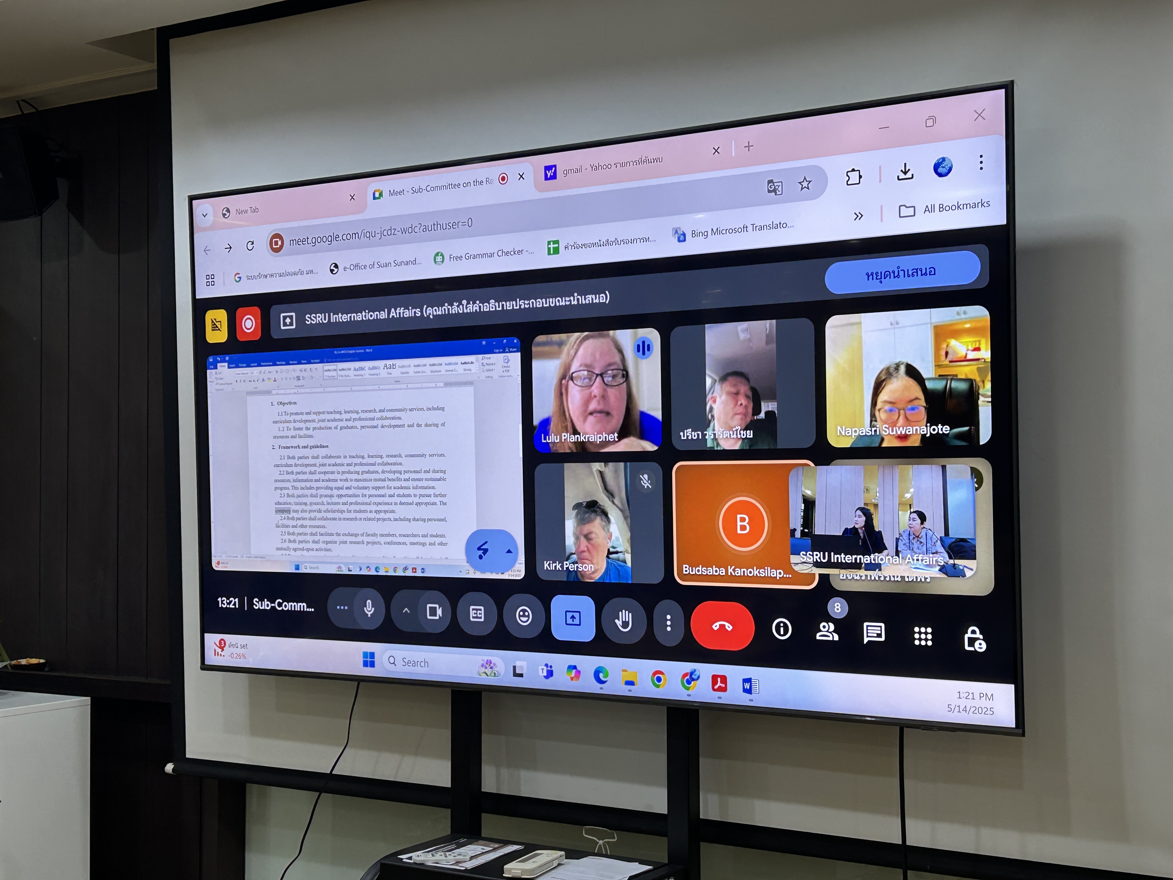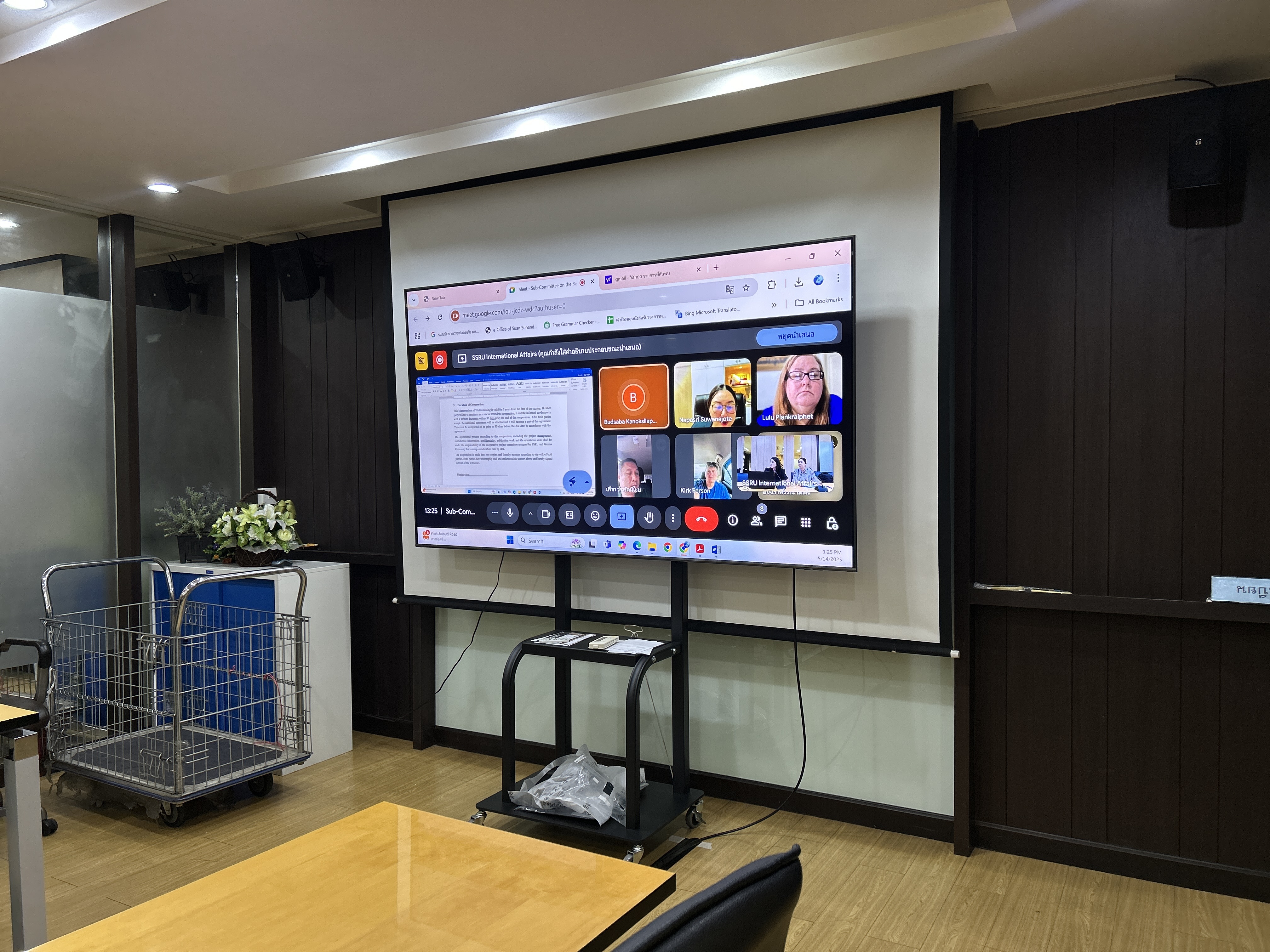 The meeting was held to review, screen, and verify the accuracy of English versions of academic MoUs, ensuring consistency with their Thai counterparts before submission to the Academic Council and the University Council for approval. Participants included Dr. Napasri Suwanajote, Prof. Dr. Budsaba Kanoksilapatham, Asst. Prof. Dr. Kirk Roger Person, and Ms. Jennilou Thomson Plankriphet, at the Bannasorn room, 4th floor, the Office of the President, and also conducted online via Google Meet.