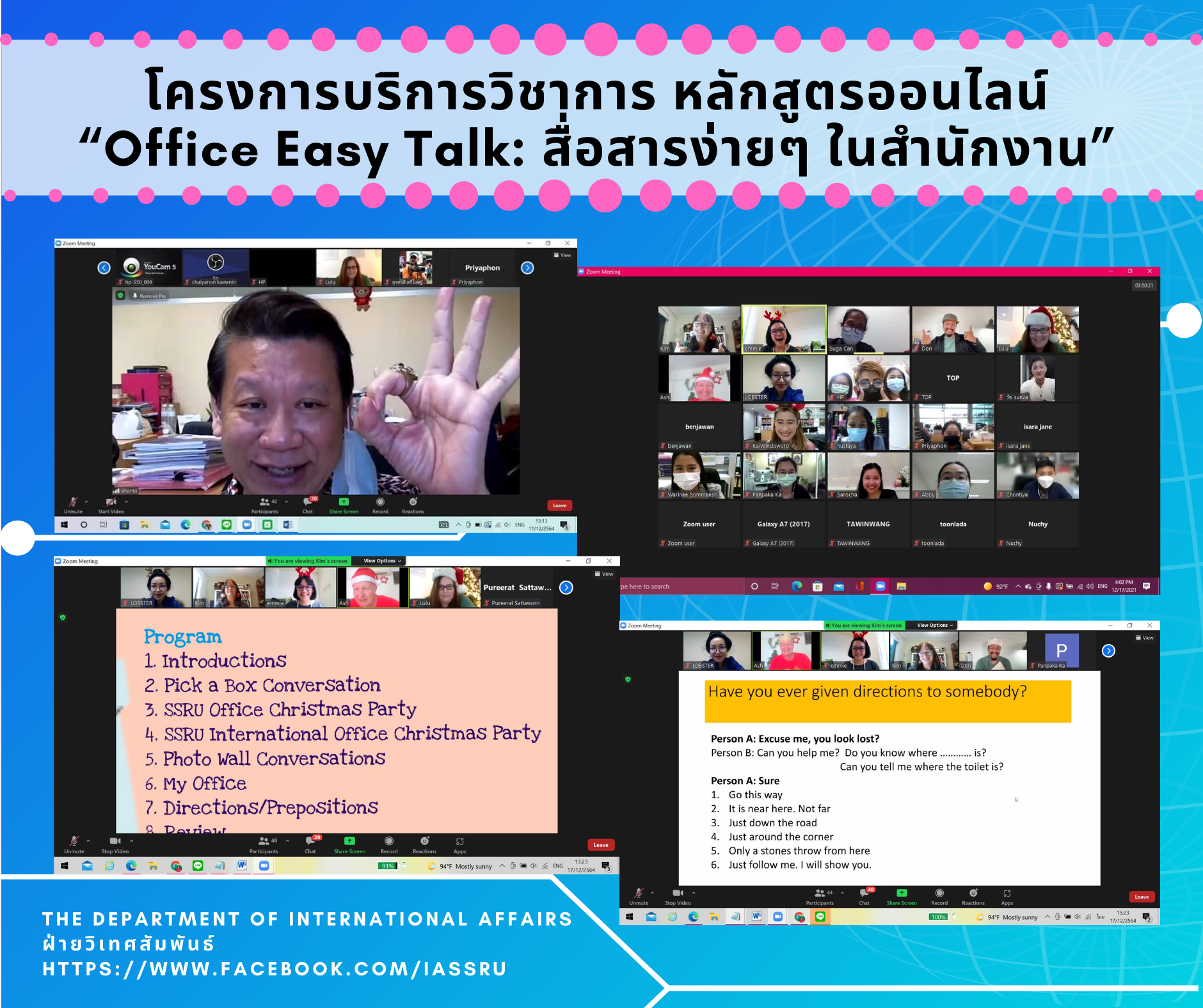 December 17, 2021 – The Department of International Affairs launched an academic service project “Office Easy Talk.” The project aimed to enhance everyday English communication skill, in particular, verbal language. The target group was SSRU staffs and general public. There were 50 participants successfully completed the program. The workshop received a great support from guest speakers from Baptist Student Center; Sujinda Zhartthong, Kim & Ashley Hood, and Lulu & Wutichai Plankraiphet.
