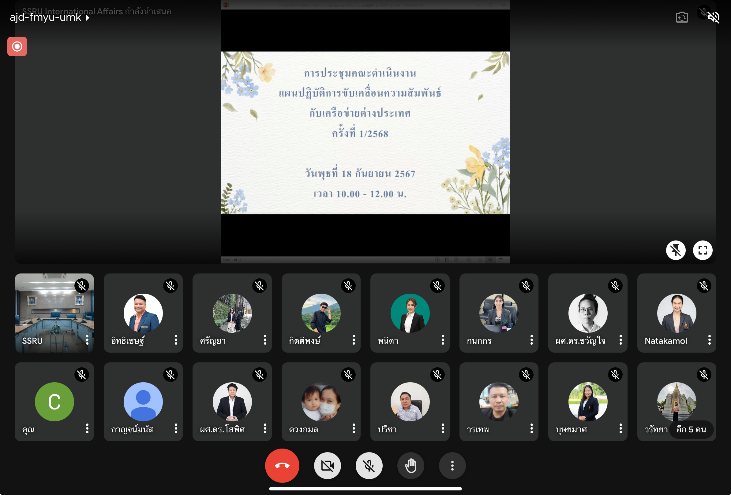วันที่ ๑๘ กันยายน ๒๕๖๗ - ฝ่ายวิเทศสัมพันธ์ โดย ผู้ช่วยศาสตราจารย์ ดร.ปรีชา วรารัตน์ไชย ผู้ช่วยอธิการบดีฝ่ายวิเทศสัมพันธ์ และนางสาวนุชนารถ เพ็งสุริยา รักษาการหัวหน้าฝ่ายวิเทศสัมพันธ์ ได้จัดการประชุมคณะดำเนินงานแผนปฏิบัติการขับเคลื่อนความสัมพันธ์กับเครือข่ายต่างประเทศประจำปีงบประมาณ พ.ศ. ๒๕๖๘ ครั้งที่ ๑/๒๕๖๘ โดยมีวัตถุประสงค์เพื่อชี้แจงแนวทางการดำเนินงาน และคำอธิบายตัวชี้วัด 4.3.1 ประจำปีงบประมาณ พ.ศ. ๒๕๖๘ ให้แก่ผู้บริหารและเจ้าหน้าที่ที่รับผิดชอบ จำนวน 15 หน่วยงาน ณ ห้องประชุมบรรณาศรม ชั้น ๔ สำนักงานอธิการบดี และรูปแบบออนไลน์ผ่านระบบ Google Meet