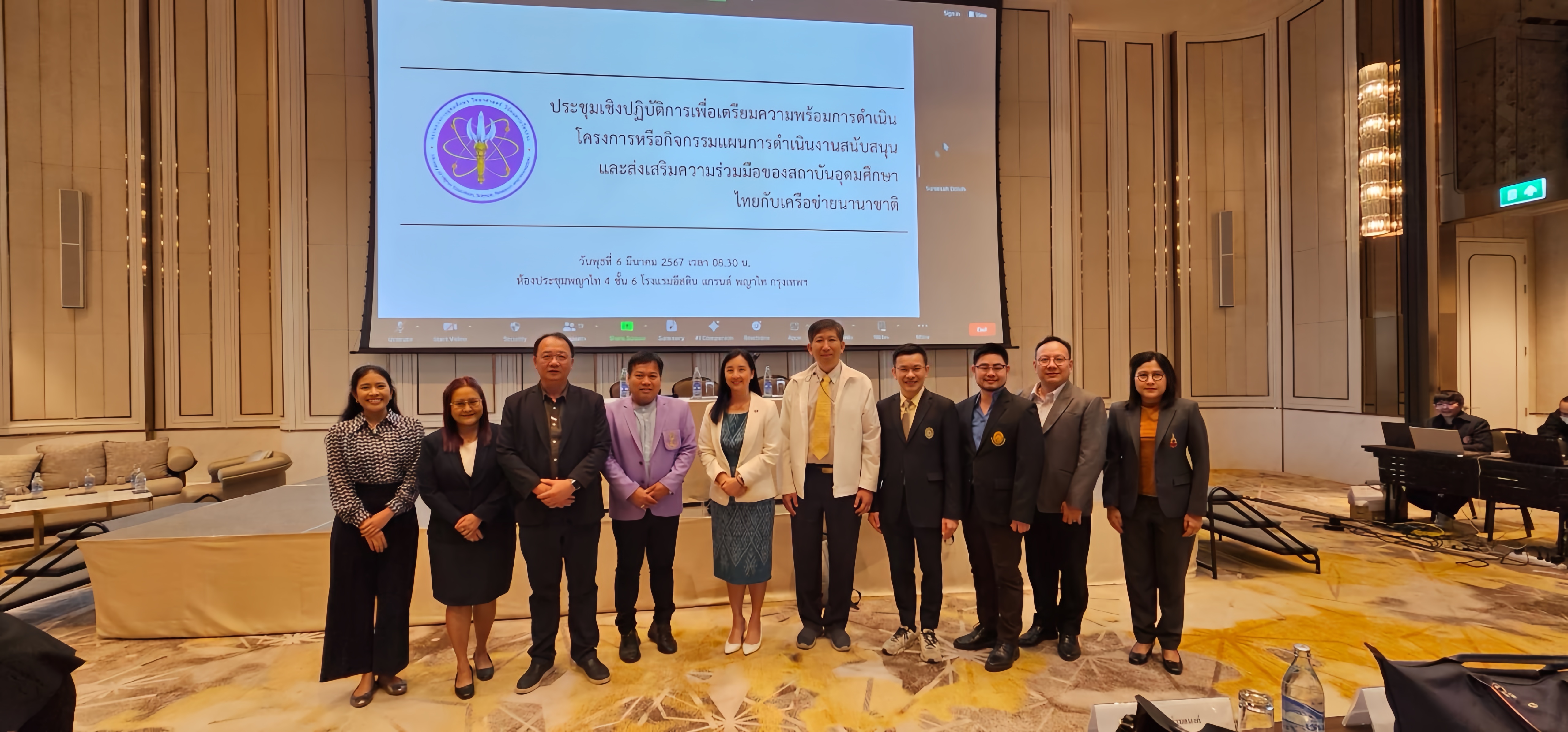 วันที่ ๖ มีนาคม ๒๕๖๗ - ฝ่ายวิเทศสัมพันธ์ โดย ผศ. สิริอร จำปาทอง ผู้ช่วยอธิการบดีฝ่ายวิเทศสัมพันธ์ เข้าร่วมการประชุมเชิงปฏิบัติการเพื่อเตรียมความพร้อมการดำเนินโครงการหรือกิจกรรมแผนการดำเนินงานการสนับสนุนและส่งเสริมความร่วมมือของสถาบันอุดมศึกษาไทยกับเครือข่ายนานาชาติ ณ โรงแรมอีสติน แกรนด์ พญาไท กรุงเทพฯ