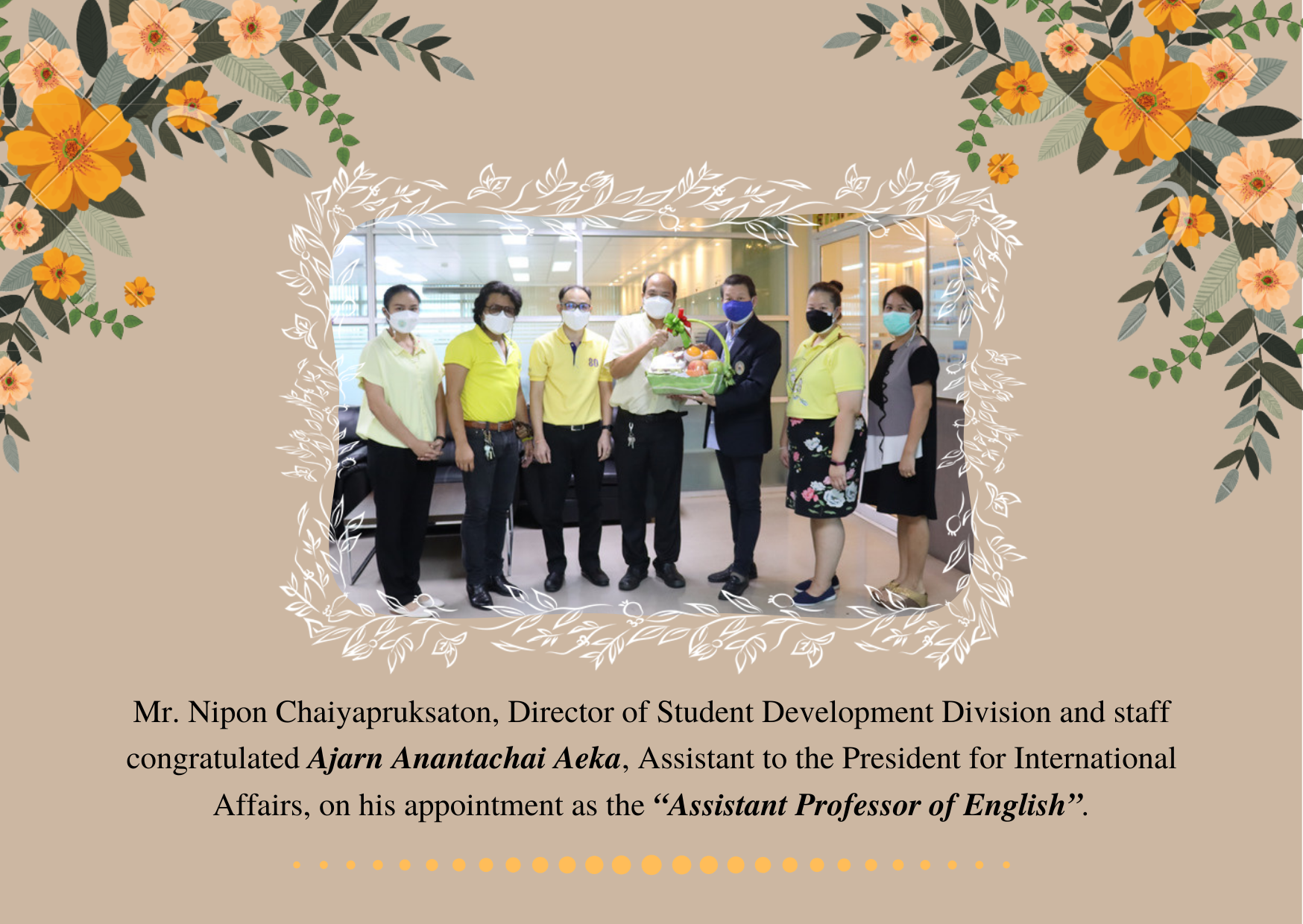 11 ตุลาคม 2564 – นายนิพนธ์ ชัยพฤกษทล ผู้อำนวยการกองพัฒนานักศึกษา พร้อมด้วยเจ้าหน้าที่ เข้าแสดงความยินดีแก่ อาจารย์อนันตชัย เอกะ ผู้ช่วยอธิการบดีฝ่ายวิเทศสัมพันธ์ ในโอกาสที่ได้รับตำแหน่ง “ผู้ช่วยศาสตราจารย์ในสาขาวิชาภาษาอังกฤษ”