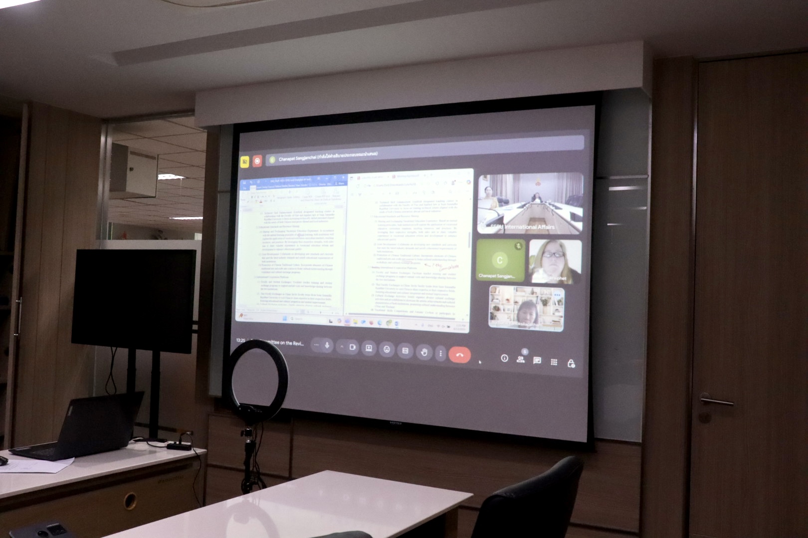 วันที่ ๑๓ สิงหาคม ๒๕๖๘ เวลา ๑๓.๐๐ น. – ฝ่ายวิเทศสัมพันธ์ โดย ผู้ช่วยศาสตราจารย์ ดร.ปรีชา วรารัตน์ไชย ผู้ช่วยอธิการบดีฝ่ายวิเทศสัมพันธ์ เป็นประธาน การประชุมอนุกรรมการกลั่นกรองบันทึกความร่วมมือทางวิชาการ ฉบับภาษาอังกฤษ มหาวิทยาลัยราชภัฏสวนสุนันทา ครั้งที่ ๔/๒๕๖๘ เพื่อพิจารณา กลั่นกรอง ตรวจสอบความถูกต้องของบันทึกความร่วมมือทางวิชาการฉบับภาษาอังกฤษ และความสอดคล้องกับเนื้อความฉบับภาษาไทยก่อนเสนอสภาวิชาการ และสภามหาวิทยาลัยเพื่อพิจารณาอนุมัติ MOU ระหว่างมหาวิทยาลัยราชภัฏสวนสุนันทากับ Shanghai Art and Design Academy สาธารณรัฐประชาชนจีน ของคณะศิลปกรรมศาสตร์ ร่วมกับ อาจารย์ ดร.นภาศรี สุวรรณโชติ, ศาสตราจารย์ ดร.บุษบา กนกศิลปธรรม, Assistant Professor Dr. Kirk Roger Person, และ Ms. Jennilou Thomson Plankriphet ณ ห้องประชุมปัญจมราช ชั้น 1 สำนักงานอธิการบดี และรูปแบบออนไลน์ผ่านระบบ Google Meet.