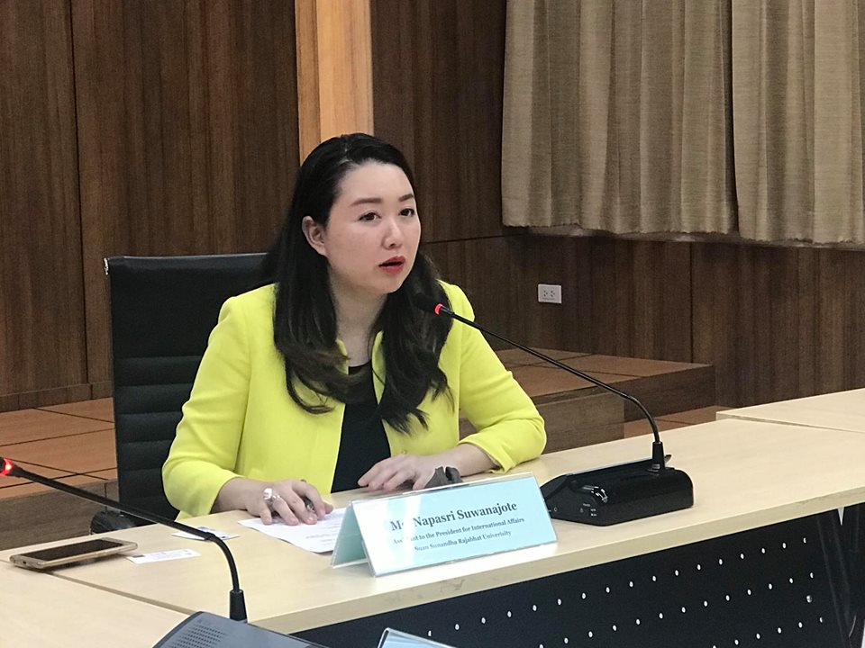 วันที่ 9 เมษายน 2562 ฝ่ายวิเทศสัมพันธ์ร่วมกับตัวแทนจากคณะและวิทยาลัยต่่างๆ จัดการประชุมหารือข้อตกลงความเข้าใจกับมหาวิทยาลัยนอร์ทแฮมป์ตัน สหราชอาณาจักร โดยมี ดร. หทัยรัตน์ เลิศจรรยากิจ ผู้จัดการด้านการตลาดและความสัมพันธ์ระหว่างประเทศ ณ ห้องประชุมวรลักษณานงค์ อาคารศูนย์สุขภาพและกีฬา ชั้น 3 มหาวิทยาลัยราชภัฏสวนสุนันทา การหารือครั้งนี้ได้กล่าวถึงการทำหลักสูตรสองปริญญาในลักษณะ 3+1 ความร่วมมือทางด้านวิชาการและวิจัย รวมทั้งการแลกเปลี่ยนนักศึกษาและคณาจารย์อีกด้วย