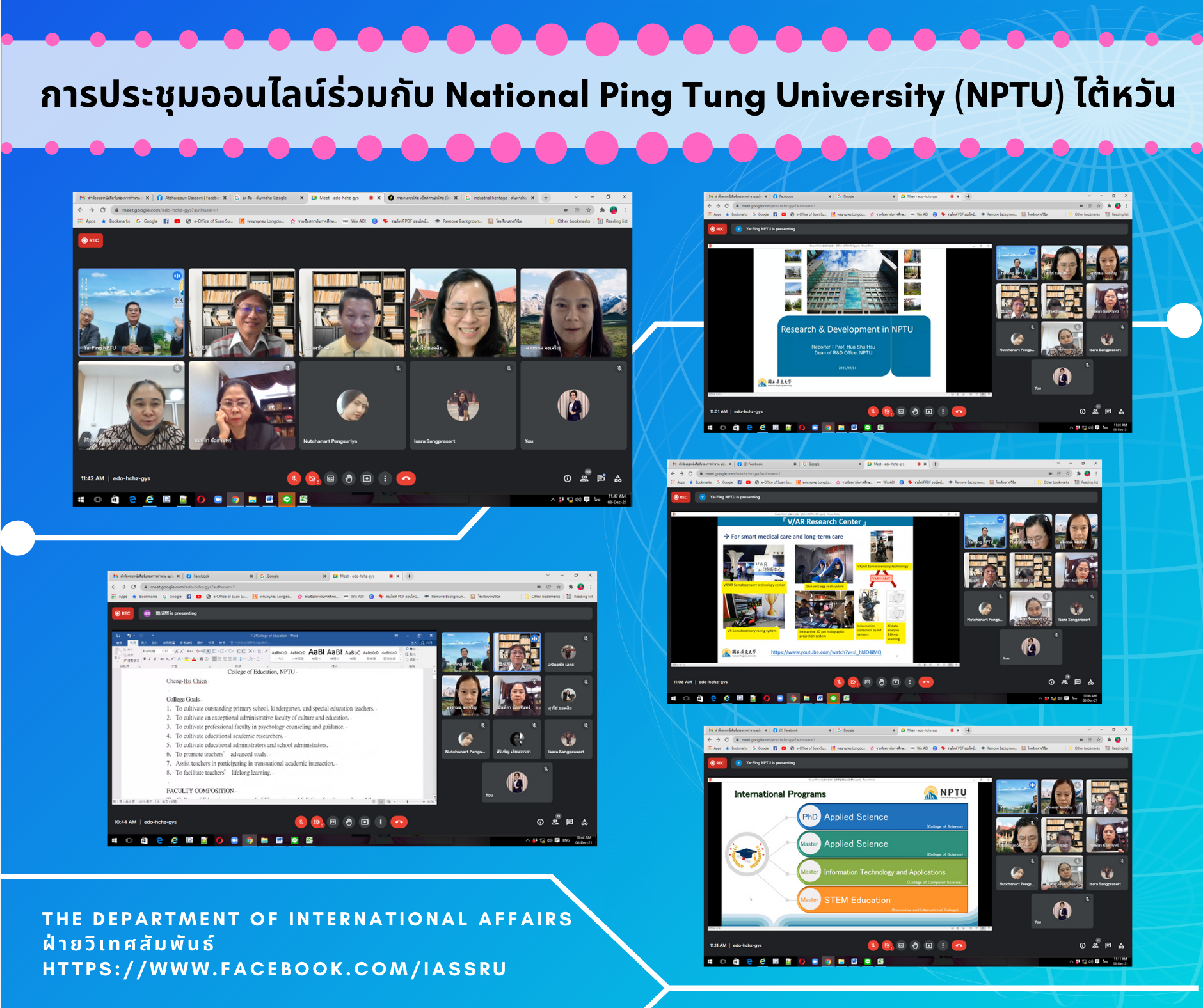 8 ธันวาคม 2564 – ผู้ช่วยศาสตราจารย์ อนันตชัย เอกะ ผู้ช่วยอธิการบดีฝ่ายวิเทศสัมพันธ์ และเจ้าหน้าที่ฝ่ายวิเทศสัมพันธ์เข้าร่วมประชุมออนไลน์กับ National Ping Tung University (NPTU) ไต้หวัน โดยมีตัวแทนของ NPTU ได้แก่ Prof. Dr. Mike Y.K. Guu – President, Assoc. Prof. Dr. Yawteng Tseng – Dean of Office of International Affairs, Prof. Dr. Hua-Shu Hsu – Dean of Office of Research & Development, Prof. Dr. Cheng-His Chien – Dean of College of Education, Assoc. Prof. Dr. Kelly Shu-Chuan Linliu – Head of Department of Leisure Management และตัวแทนของสวนสุนันทา ได้แก่ รศ. ดร. นันทิยา น้อยจันทร์ รองอธิการบดีฝ่ายวิชาการ, ผศ. ดร. สุวรีย์ ยอดฉิม รองอธิการบดีฝ่ายวิจัยและพัฒนา, อาจารย์ ดร. ดวงกมล จงเจริญ ผู้อำนวยการศูนย์พัฒนาวิชาชีพทางการศึกษา คณะครุศาสตร์ และ อาจารย์ ดร. ศิริเพ็ญ เยี่ยมจรรยา รองคณบดีฝ่ายวิชาการ วิทยาลัยการจัดการอุตสาหกรรมบริการ โดยสาระการประชุมเน้นถึงความเป็นไปได้ในการขยายความร่วมมือทางวิชาการในอนาคตระหว่าง NPTU กับ SSRU ทั้งในด้านการศึกษา และการวิจัย โดยเฉพาะอย่างยิ่งการผสมผสานเทคโนโลยีปัญญาประดิษฐ์ (Artificial Intelligence: IA), เทคโนโลยีโลกเสมือนจริง ได้แก่ Virtual Reality (VR), Augmented Reality (AR)และ Mixed Reality (MR) หรือการเชื่อมโยง Internet of Things (IoT) เป็นต้น